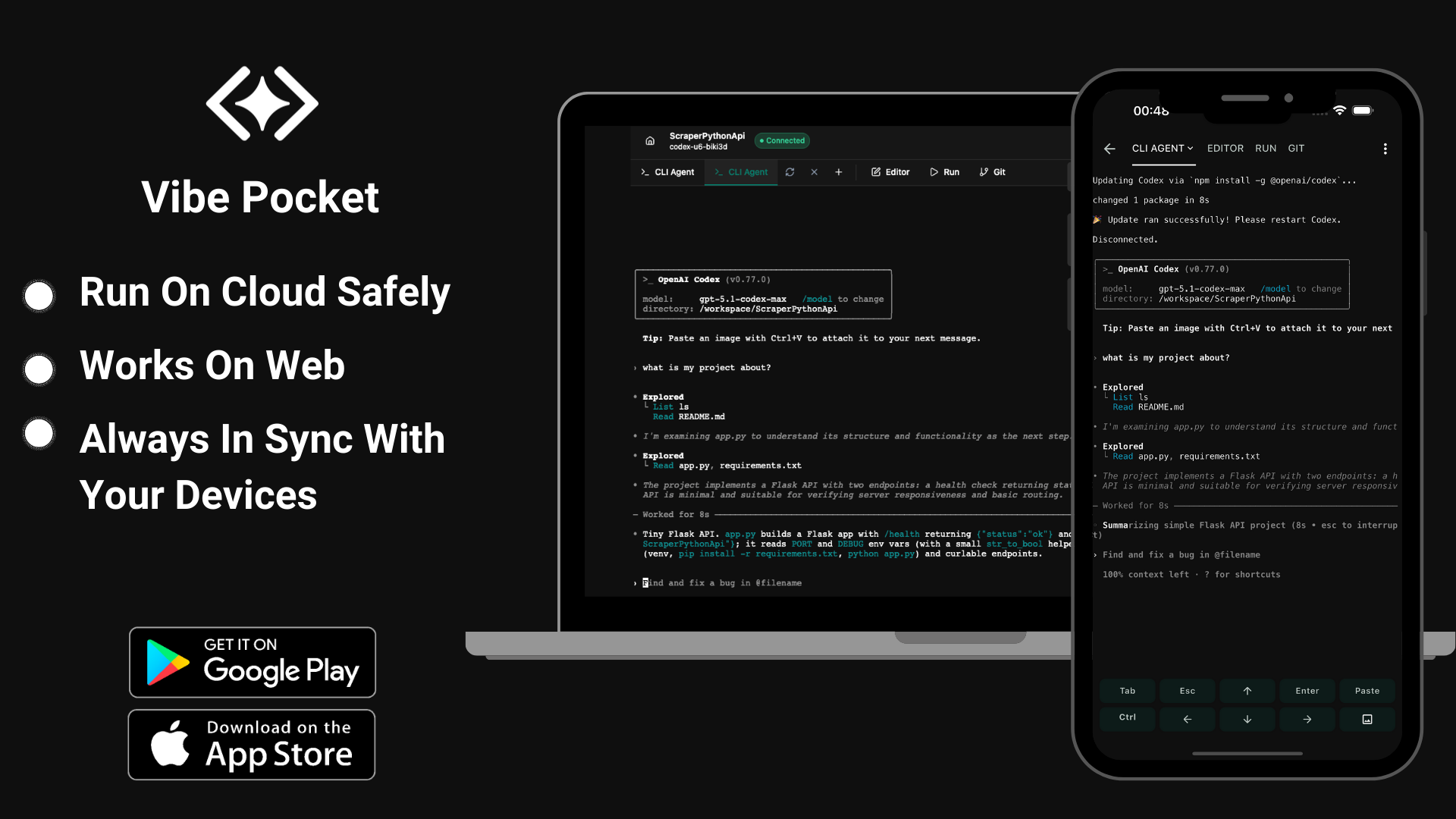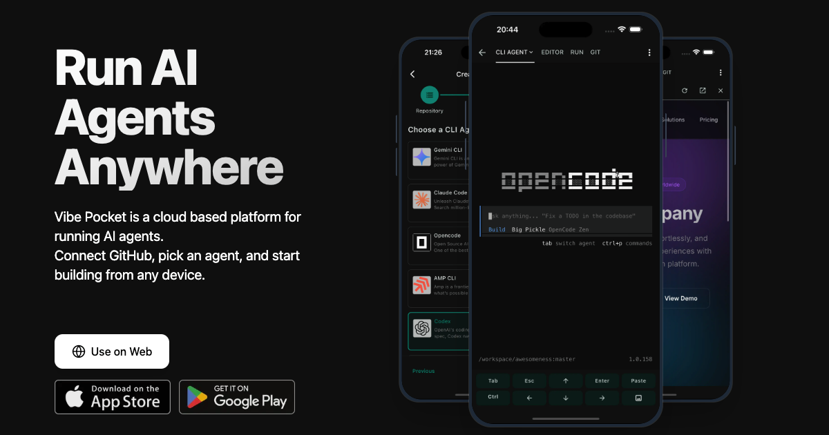 Vibe Pocket is a cloud based platform for running AI agents like Claude Code, Codex, opencode, on mobile or web. Connect GitHub, pick an agent, and start building from any device. More than 15 CLI agents are supported including Claude Code, Codex, Gemini CLI, OpenCode, Droid, AMP Cli, Crush, Aider... You can also connect to the terminal and run your apps or any command you want just like on a computer terminal easily. You can also access your running web apps directly within Vibe Pocket.