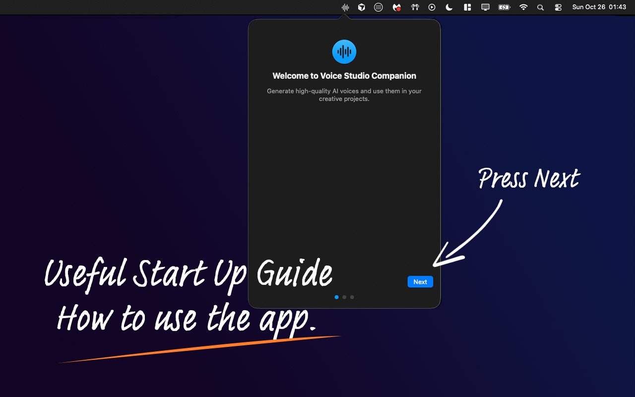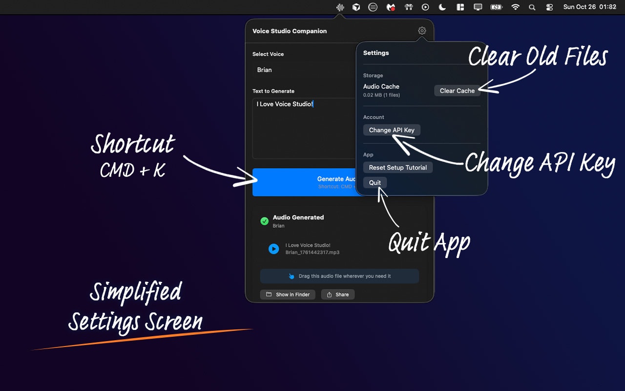 Voice Studio Companion is a macOS menu bar app that turns text into professional AI voiceovers using ElevenLabs technology. Ideal for creators and editors, it lets you choose from 20+ high-quality voices and generate audio in seconds. Drag and drop directly into Final Cut Pro, Premiere Pro, DaVinci Resolve, Logic Pro, GarageBand, Keynote, PowerPoint, and any app that accepts audio files.
