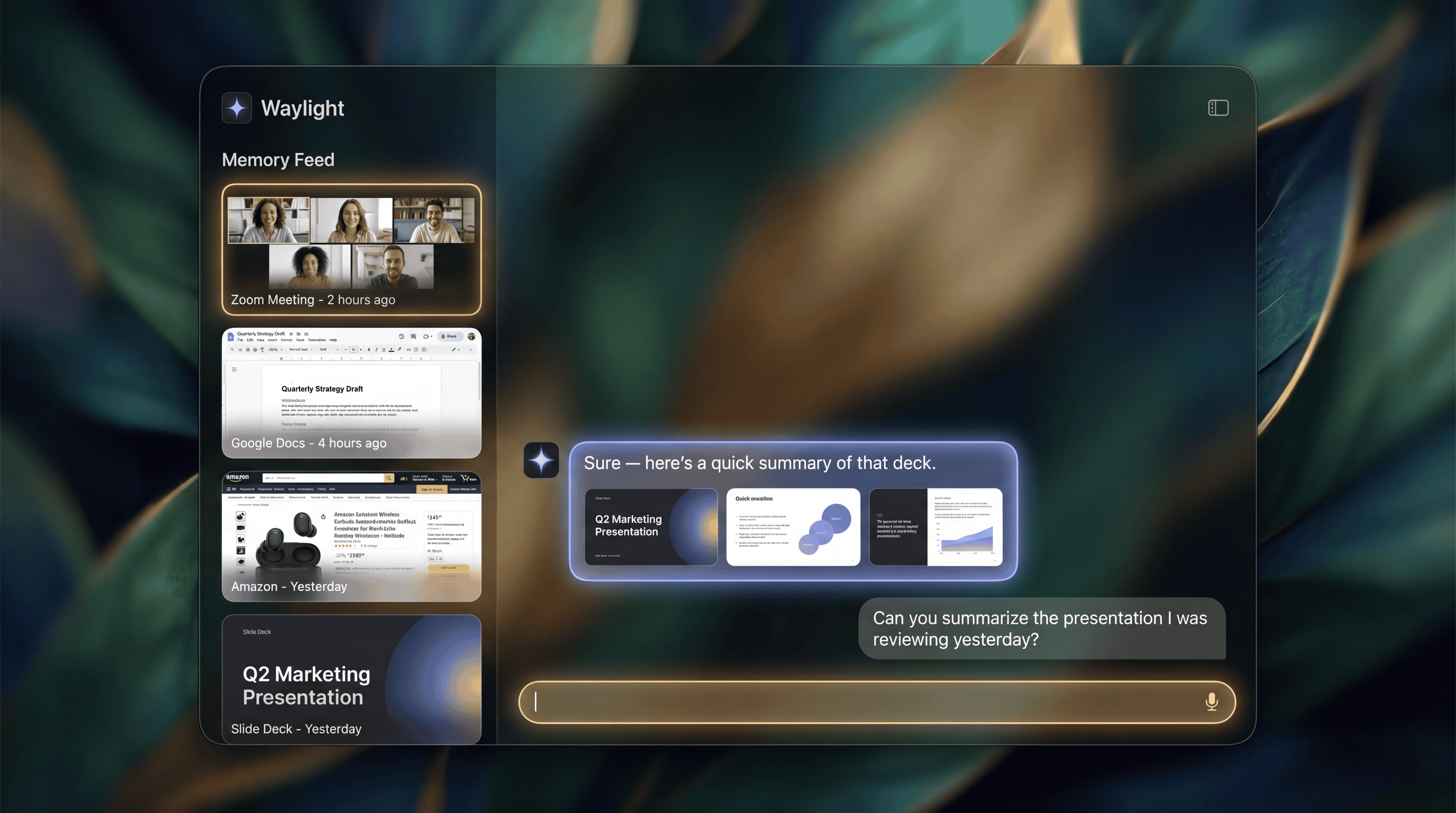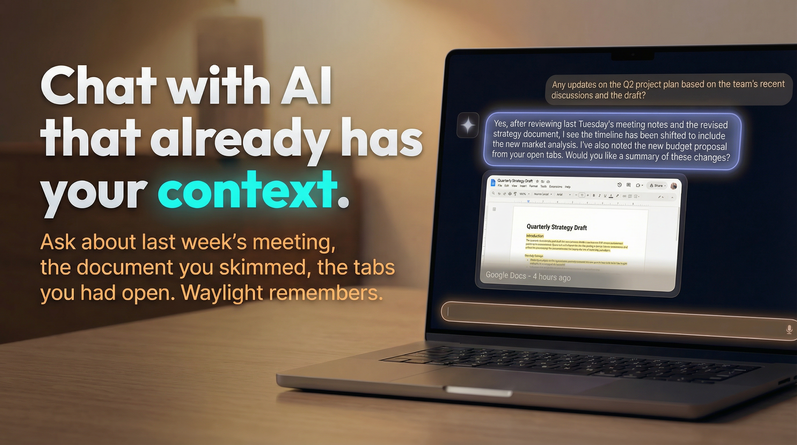 Waylight is an AI assistant that understands everything you do on your computer — your meetings, documents, tabs, and messages. It builds a private, on-device memory of your activity so you can ask questions about anything you’ve seen and get instant, accurate answers.