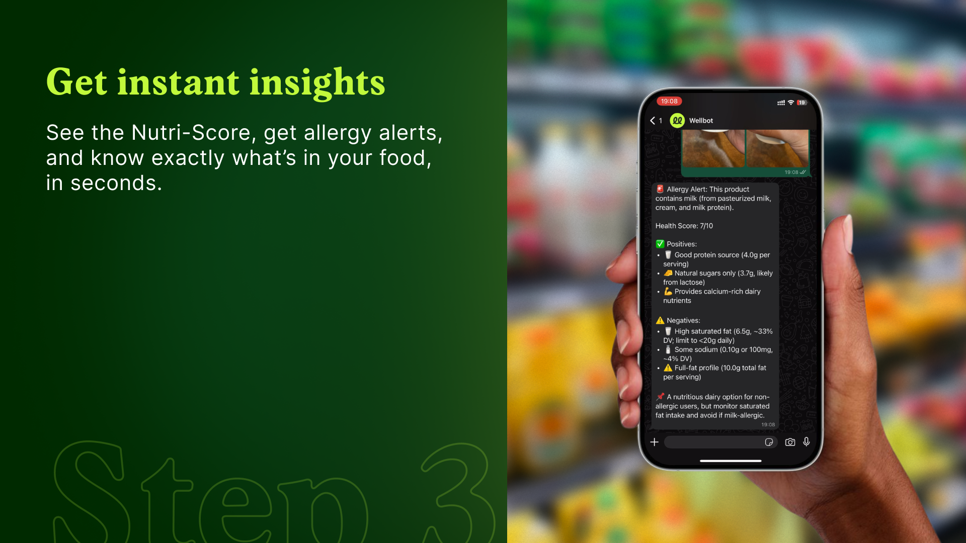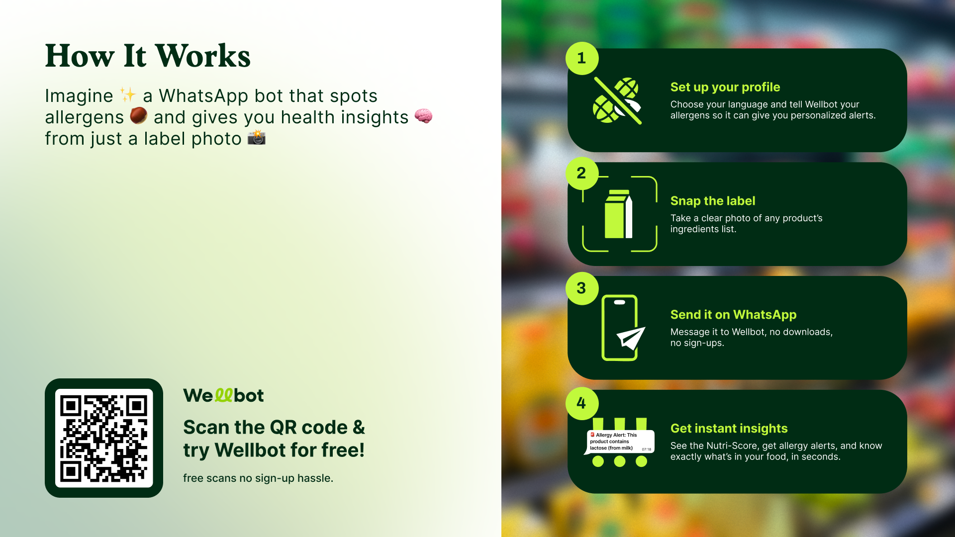 Scan food labels on WhatsApp and get instant Nutri-Scores, allergy alerts, and health insights. Wellbot makes smarter grocery shopping effortless.