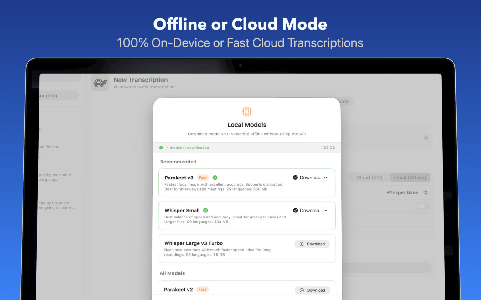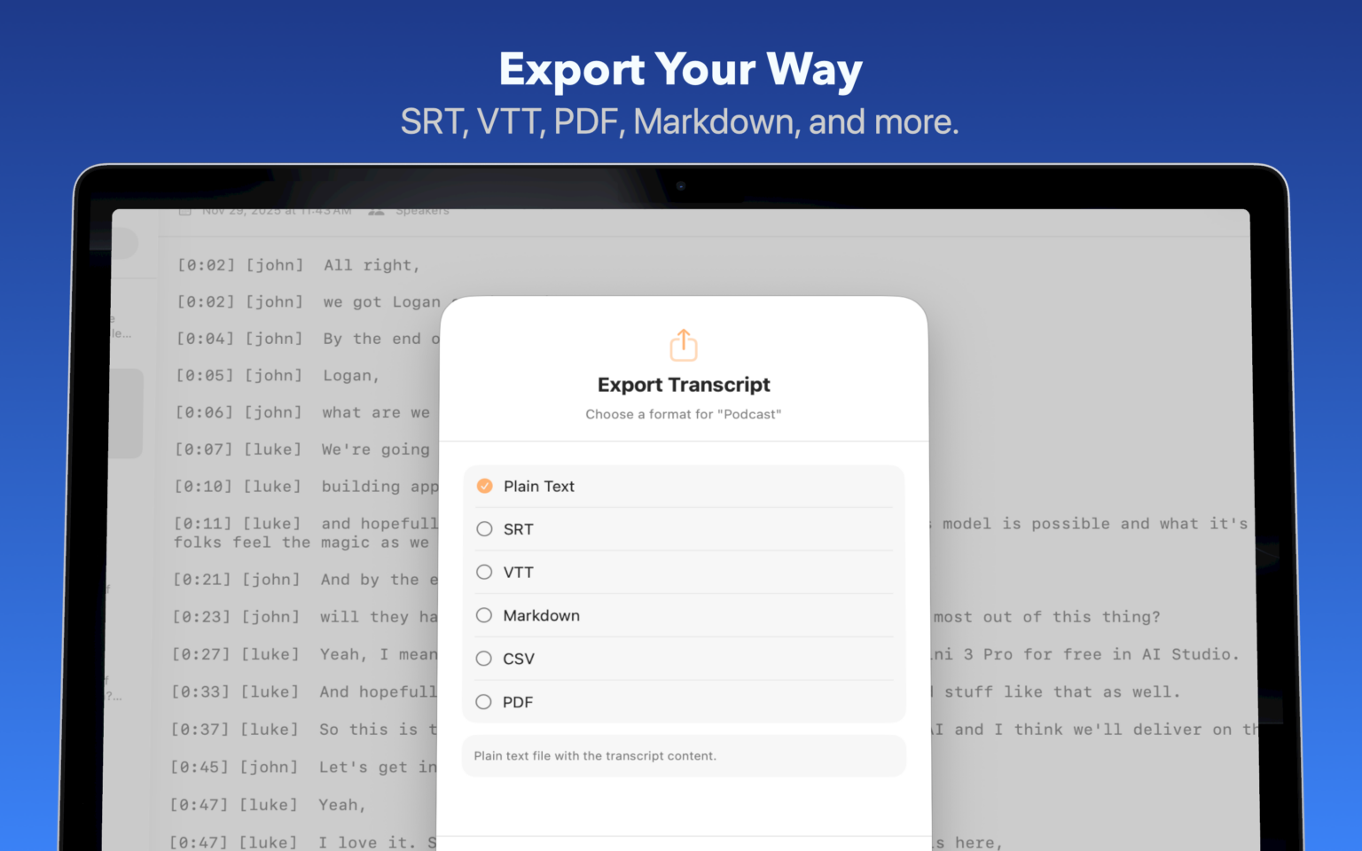 Transcribe videos, podcasts, meetings, and voice memos with the fastest, most accurate AI models—running locally on your Mac or in the cloud with your own API keys. Speaker labels, timestamps, and export to SRT, Markdown, PDF, and more. Try free or one-time lifetime $9.99 Pro.