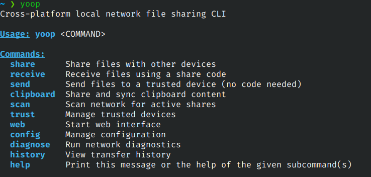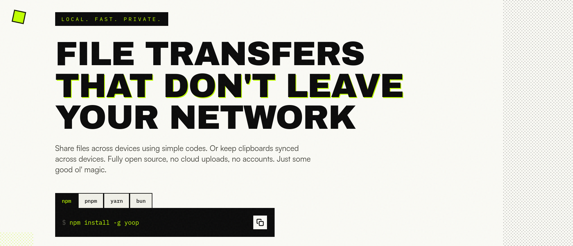 Stop uploading files to the cloud just to download them on another device 3 feet away. Download Yoop: npm install -g yoop Yoop enables direct P2P file sharing on your local network using simple 4-letter codes. Built in Rust. Works cross platform between Windows, macOS, and Linux. Features: - Encrypted transfers - Bidirectional clipboard sync across devices - Resume interrupted transfers - CLI + web interface No accounts. No cloud. Your data never leaves your network. Fully open source.