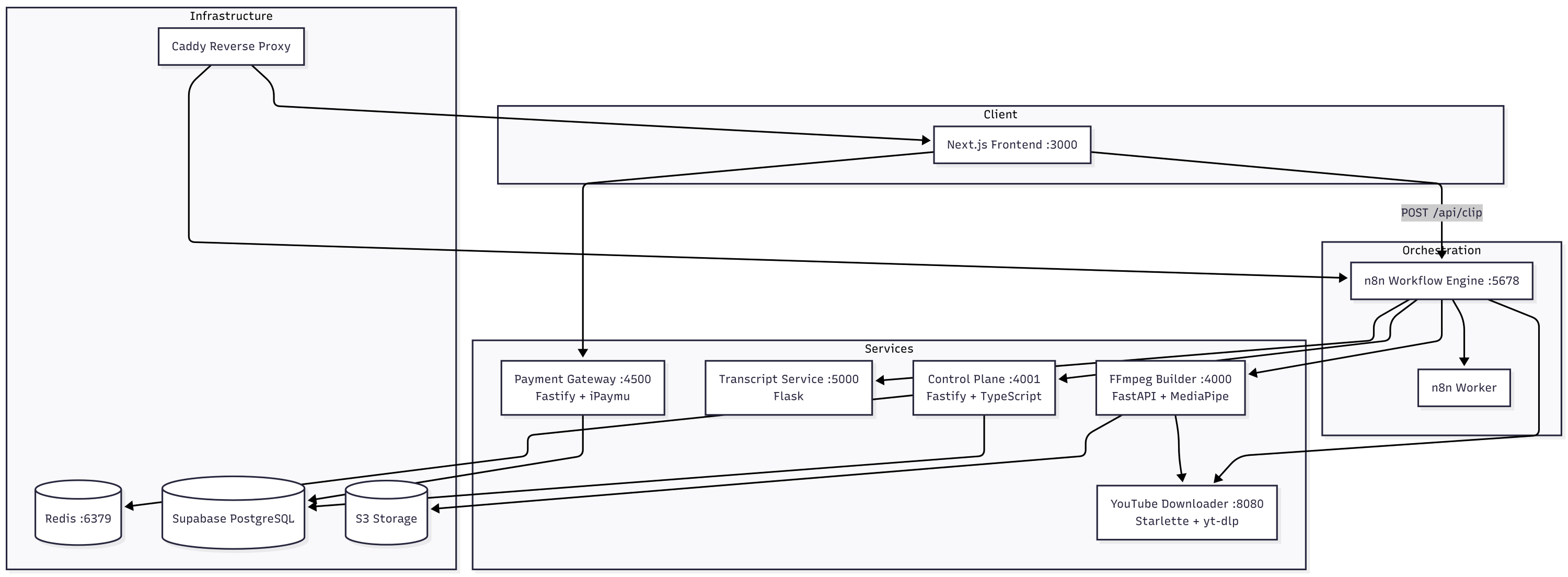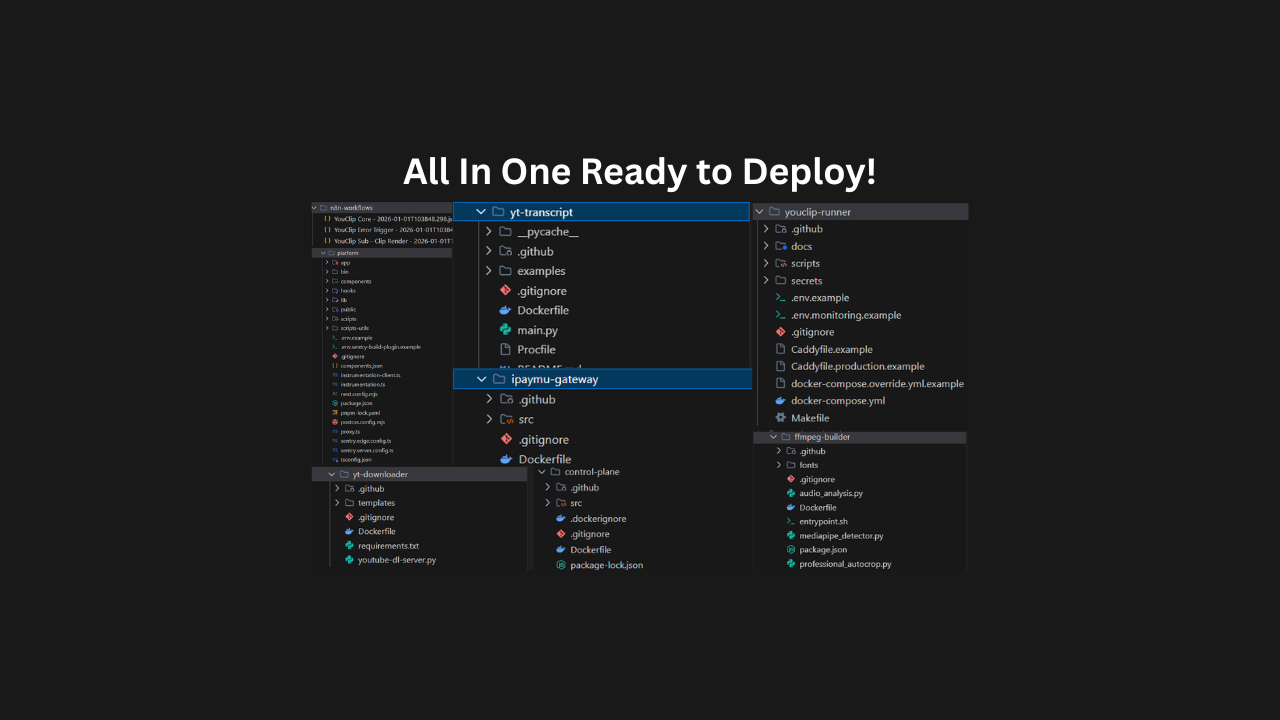 A production-grade microservices architecture to build your own AI Video Repurposing SaaS (Opus Pro clone). Includes Next.js 16 frontend, Python FFmpeg engine, and complex n8n workflows for AI viral scoring and face tracking. Save 300+ dev hours.