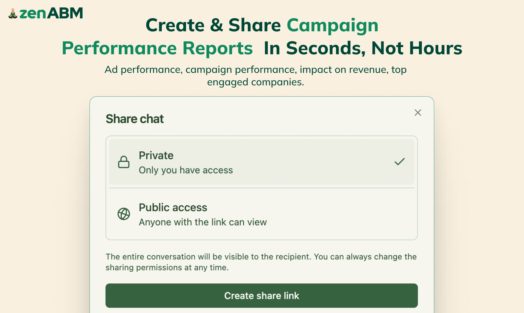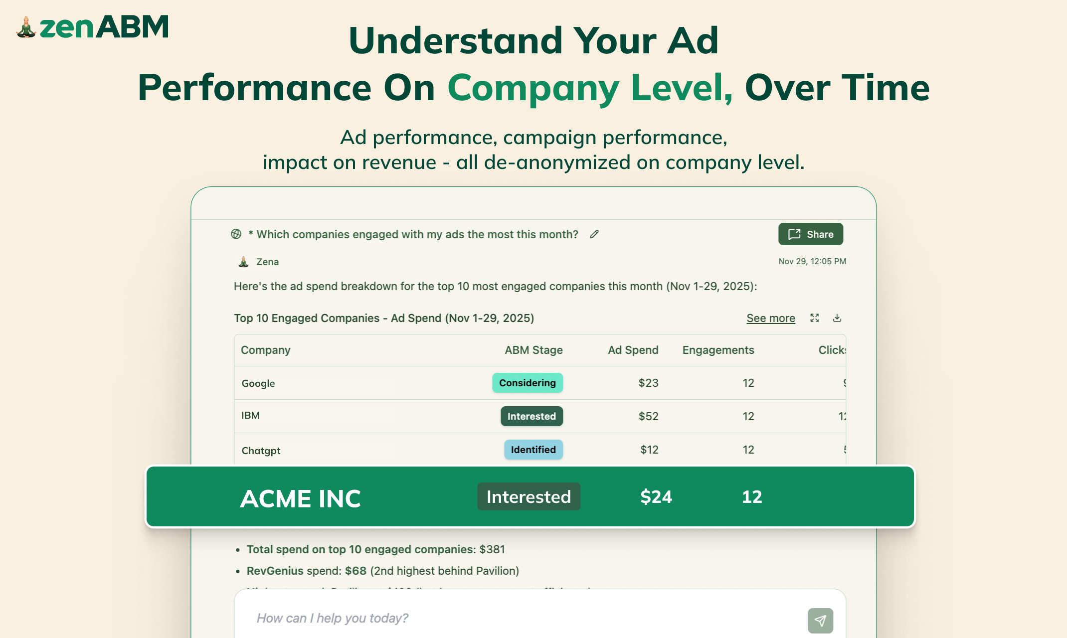 Meet Zena - ZenABM's LinkedIn Ads AI analyst! Zena (by ZenABM.com) is an AI chatbot analyzing LinkedIn Ads performance on company level. It lets you ask your LinkedIn API CRM data any questions about your top-performing ads, campaigns, most engaged companies, job titles and ad-influenced deals. You can use it produce detailed reports by combining data from LinkedIn ads API with data from your CRM in minutes - all by simply chatting to Zena.
