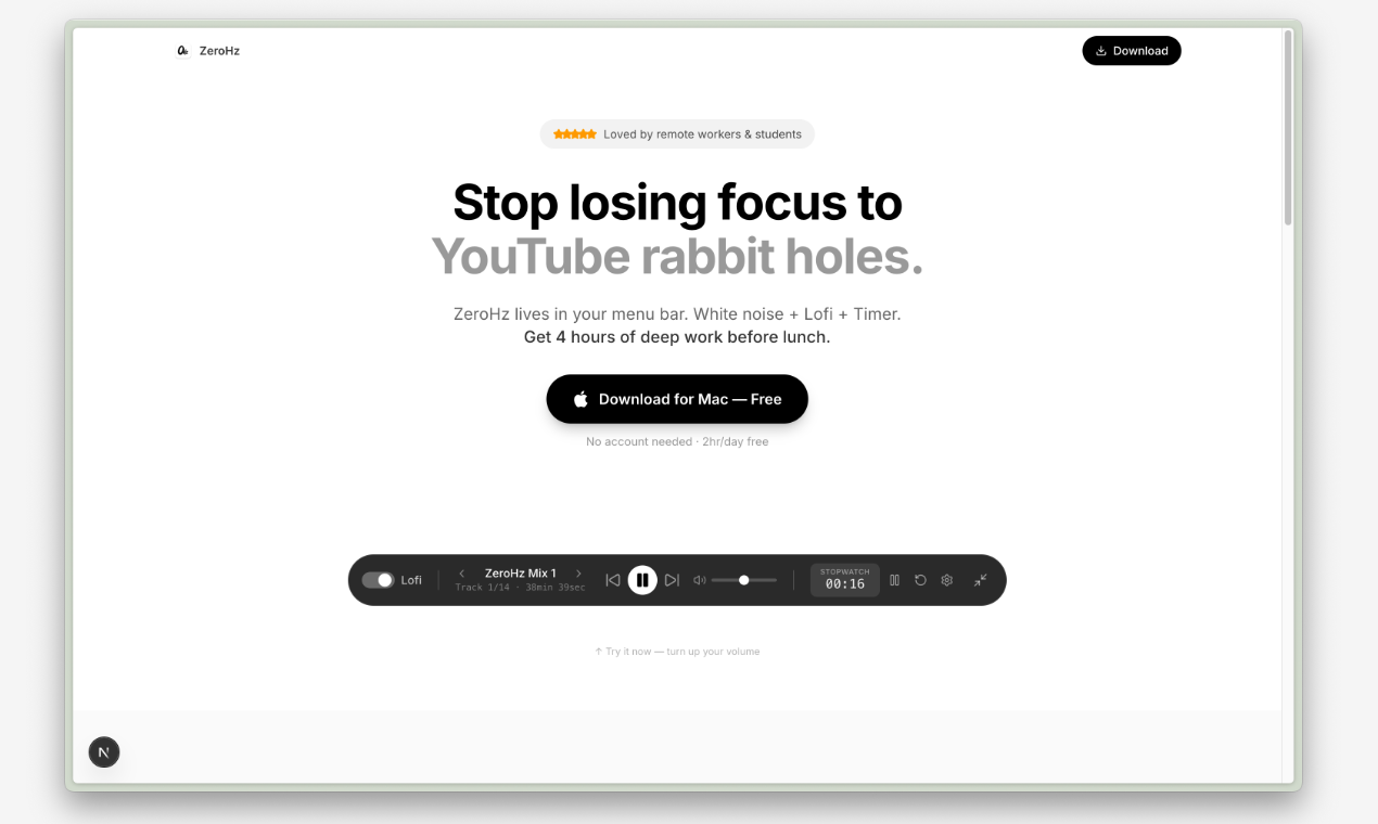 Stop losing focus to YouTube rabbit holes. ZeroHz lives in your Mac menu bar with curated lofi music, 12 ambient sounds, and a built-in timer. Get 4 hours of deep work before lunch—no account needed.