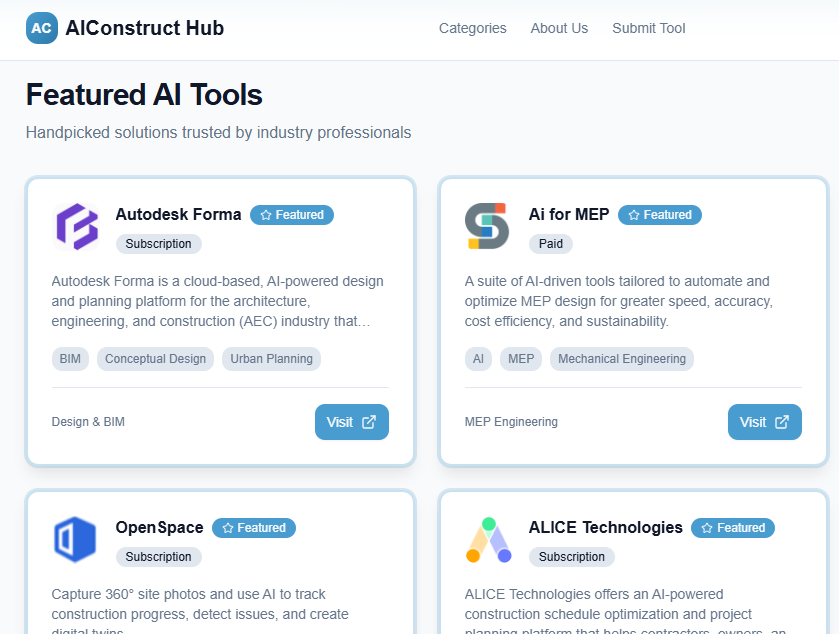 AI Construct Hub is a comprehensive digital directory and resource platform specifically curated for artificial intelligence tools in the construction industry. The site creates a comprehensive category for the apps to help professionals stay updated on emerging technologies. It serves as a central hub for contractors and engineers to discover, compare, and implement AI-driven solutions to improve project efficiency and safety.